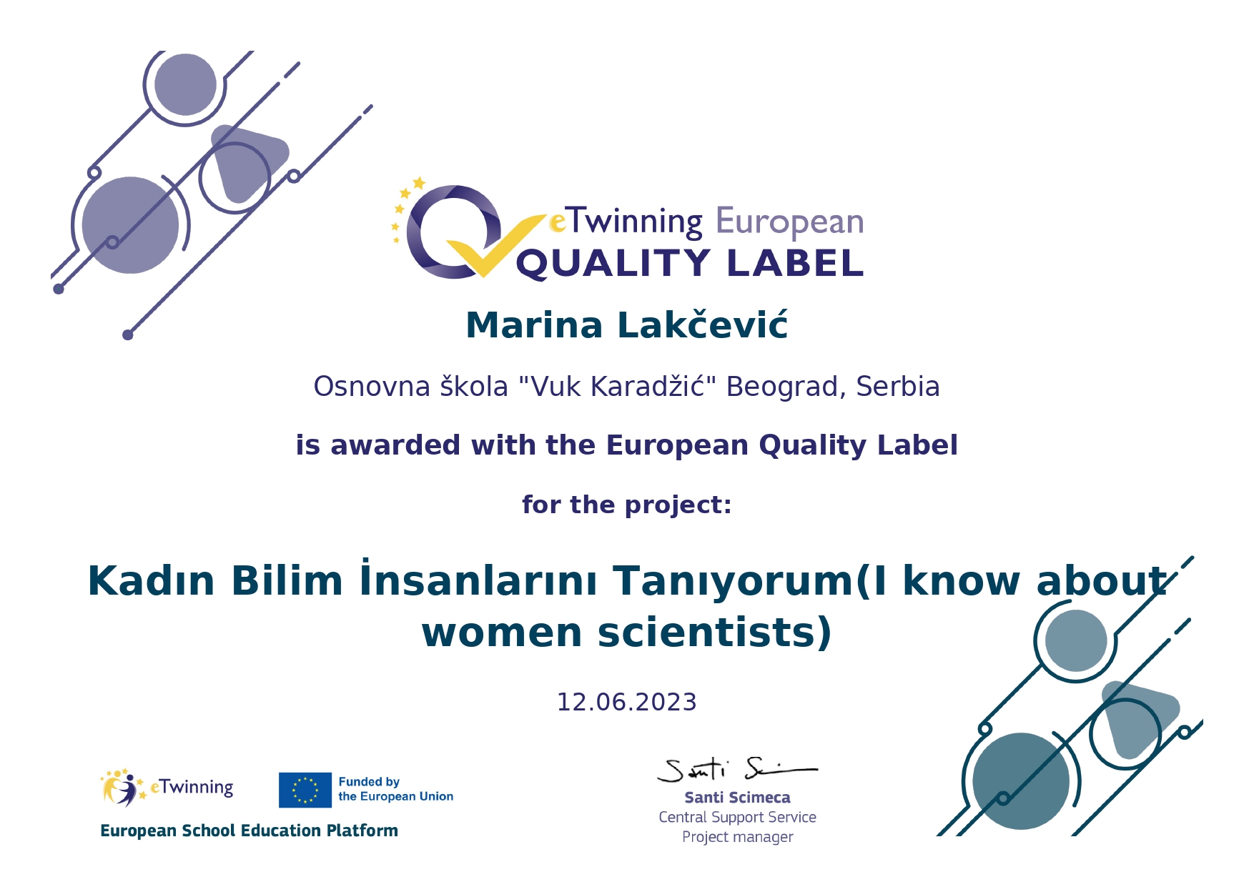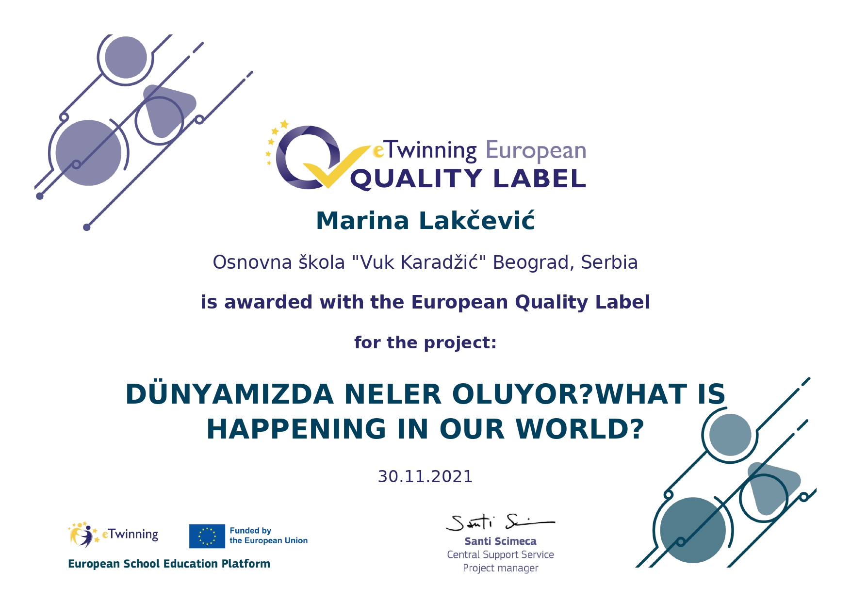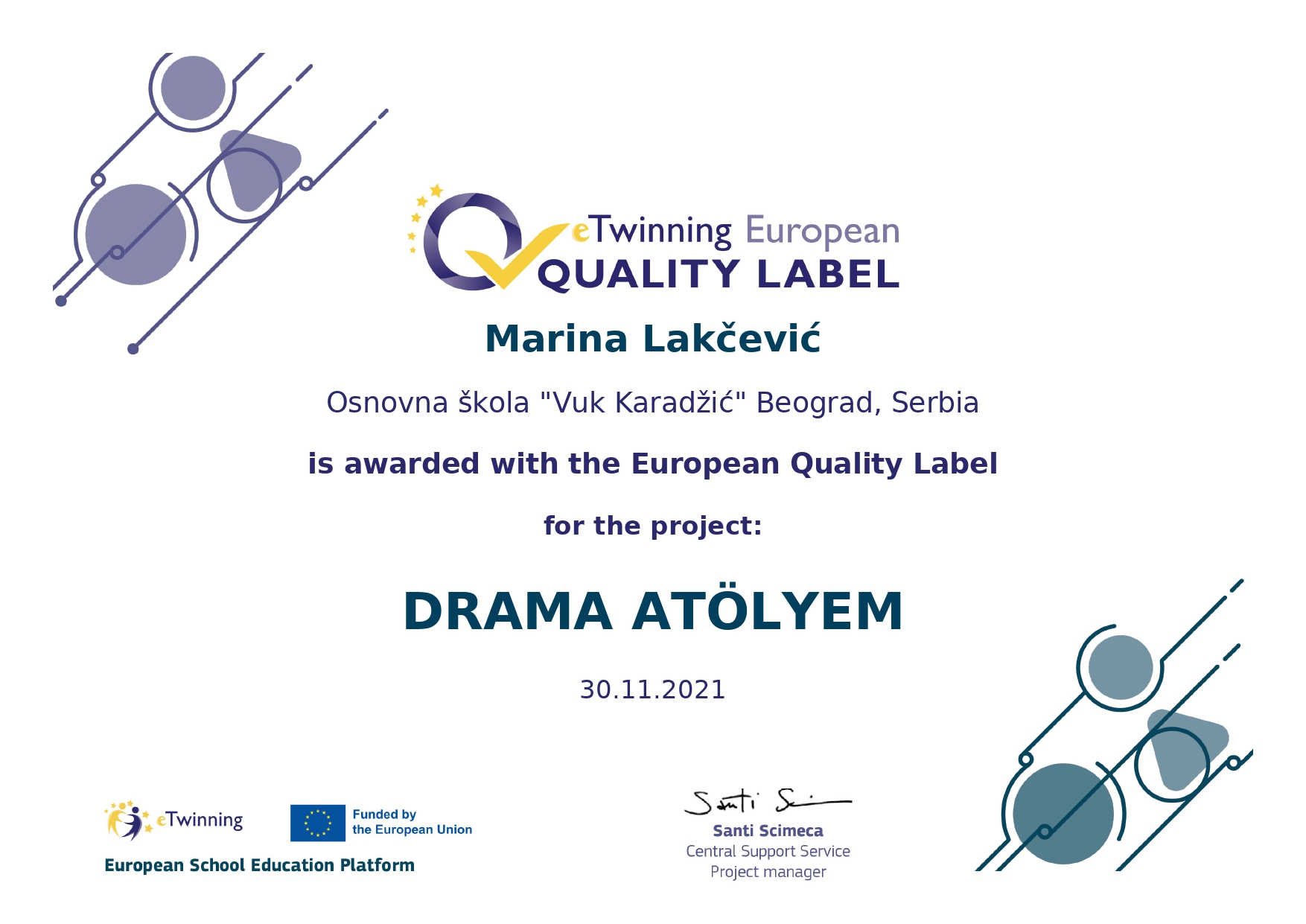 Поносно истичемо да је нашој школи додељено 14 Европских ознака квалитета за изузетност рада у оквиру пројеката. То значи да су рад наших наставника и ученика који су учествовали у пројекту, признати на највишем европском нивоу.Ови пројекти ће бити изложени у посебном простору европског портала на www.etwinning.net.