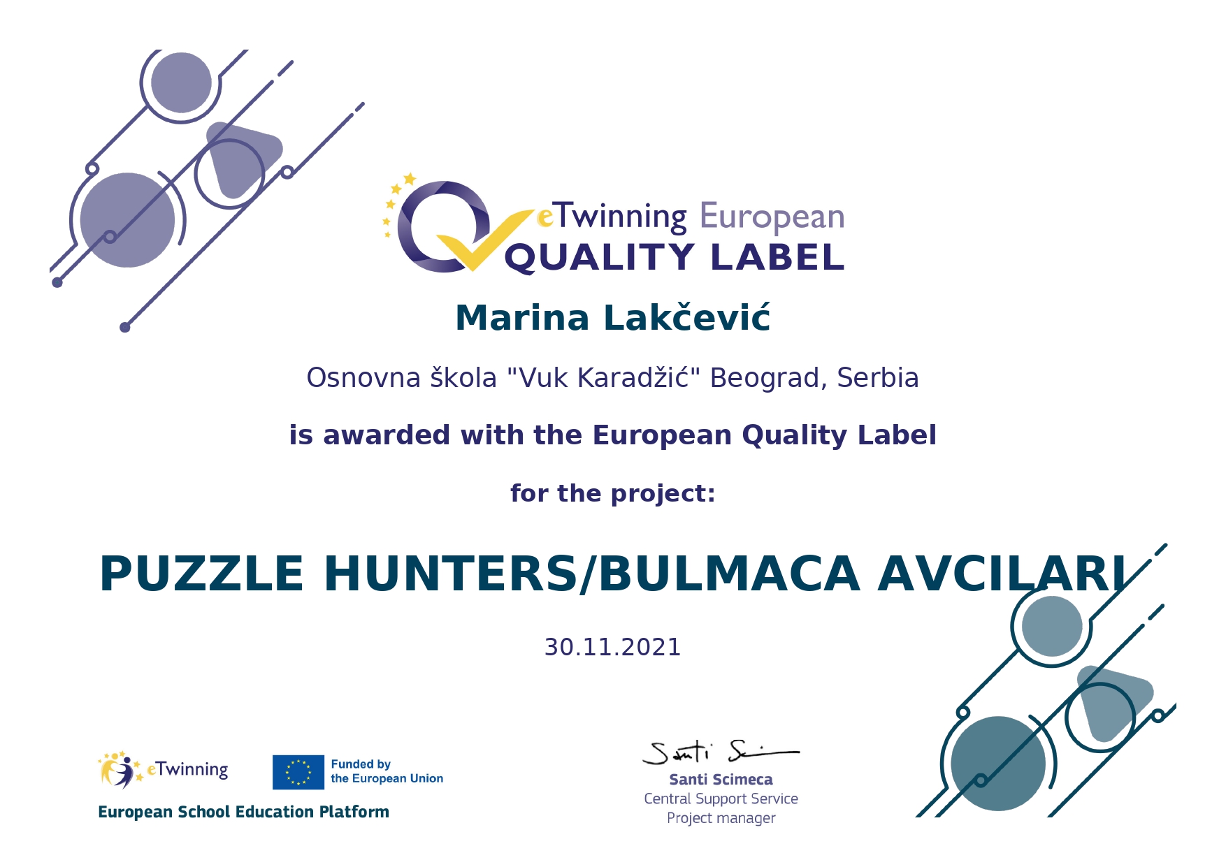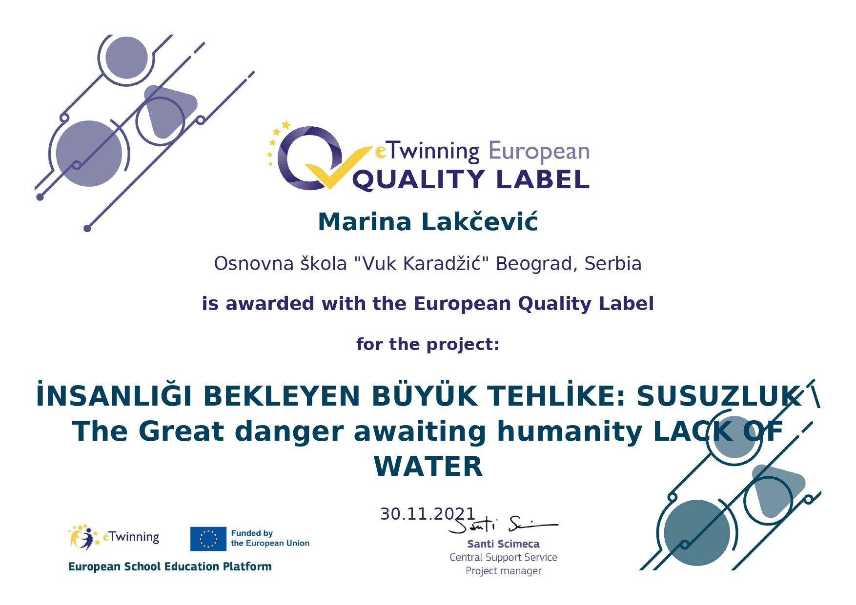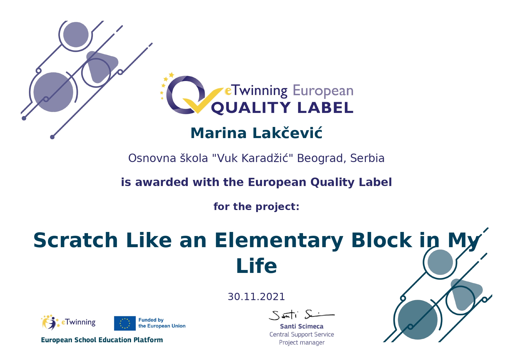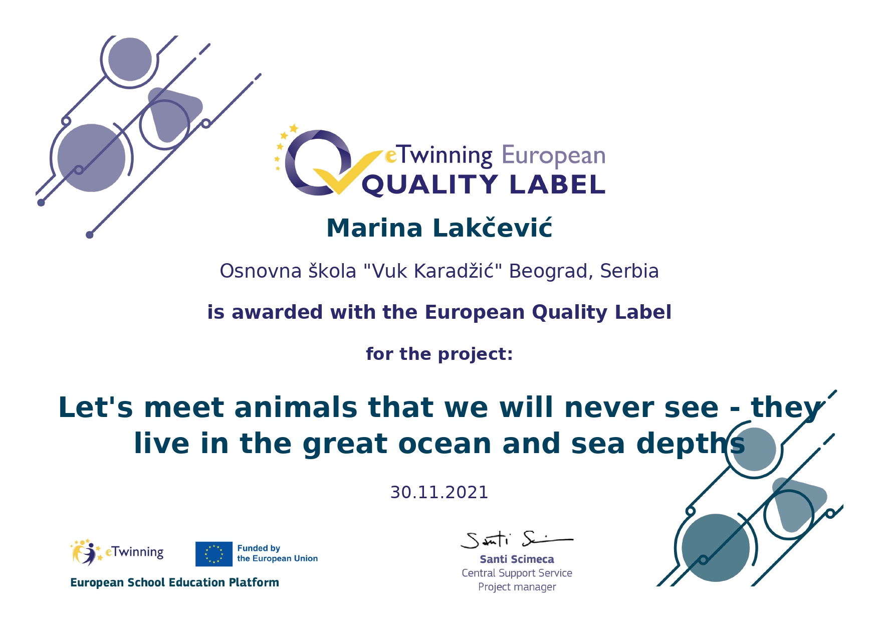 Поносно истичемо да је нашој школи додељено 14 Европских ознака квалитета за изузетност рада у оквиру пројеката. То значи да су рад наших наставника и ученика који су учествовали у пројекту, признати на највишем европском нивоу.Ови пројекти ће бити изложени у посебном простору европског портала на www.etwinning.net.