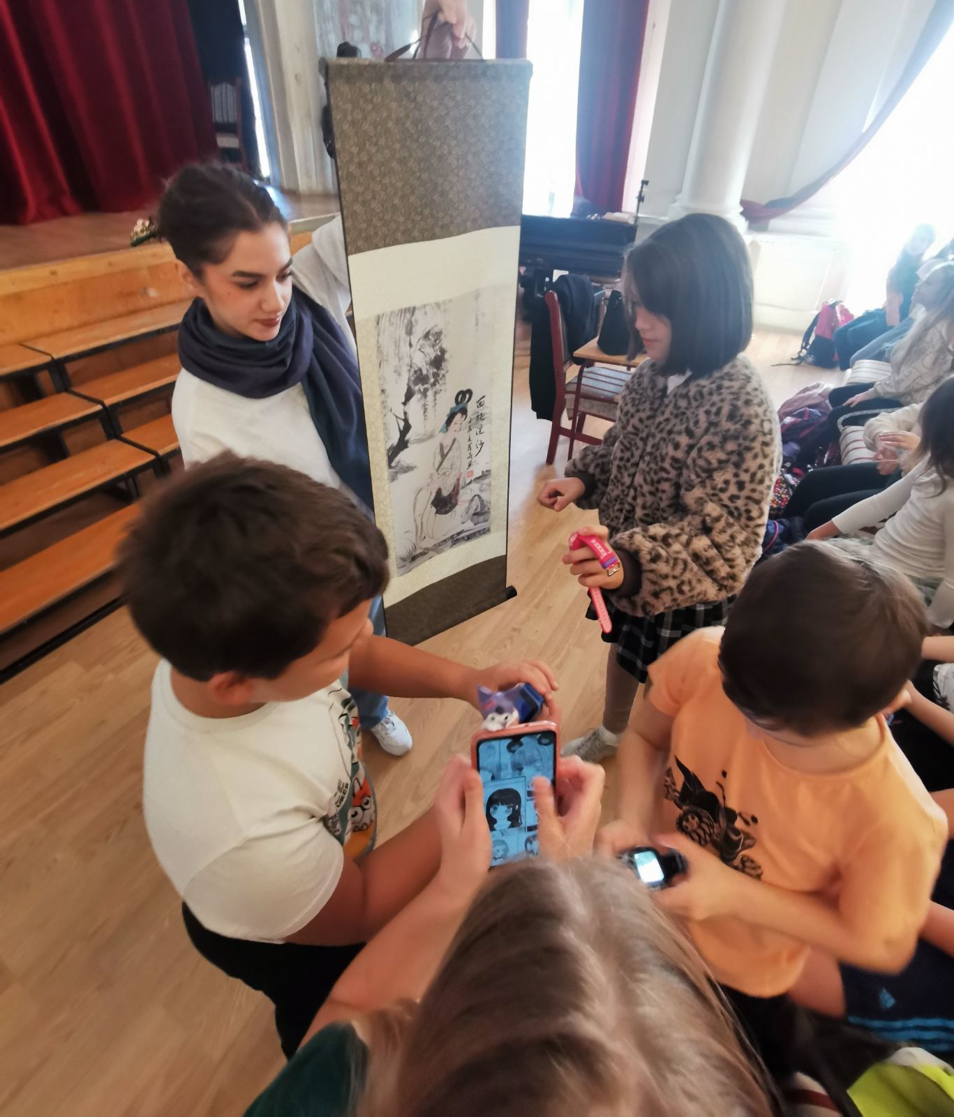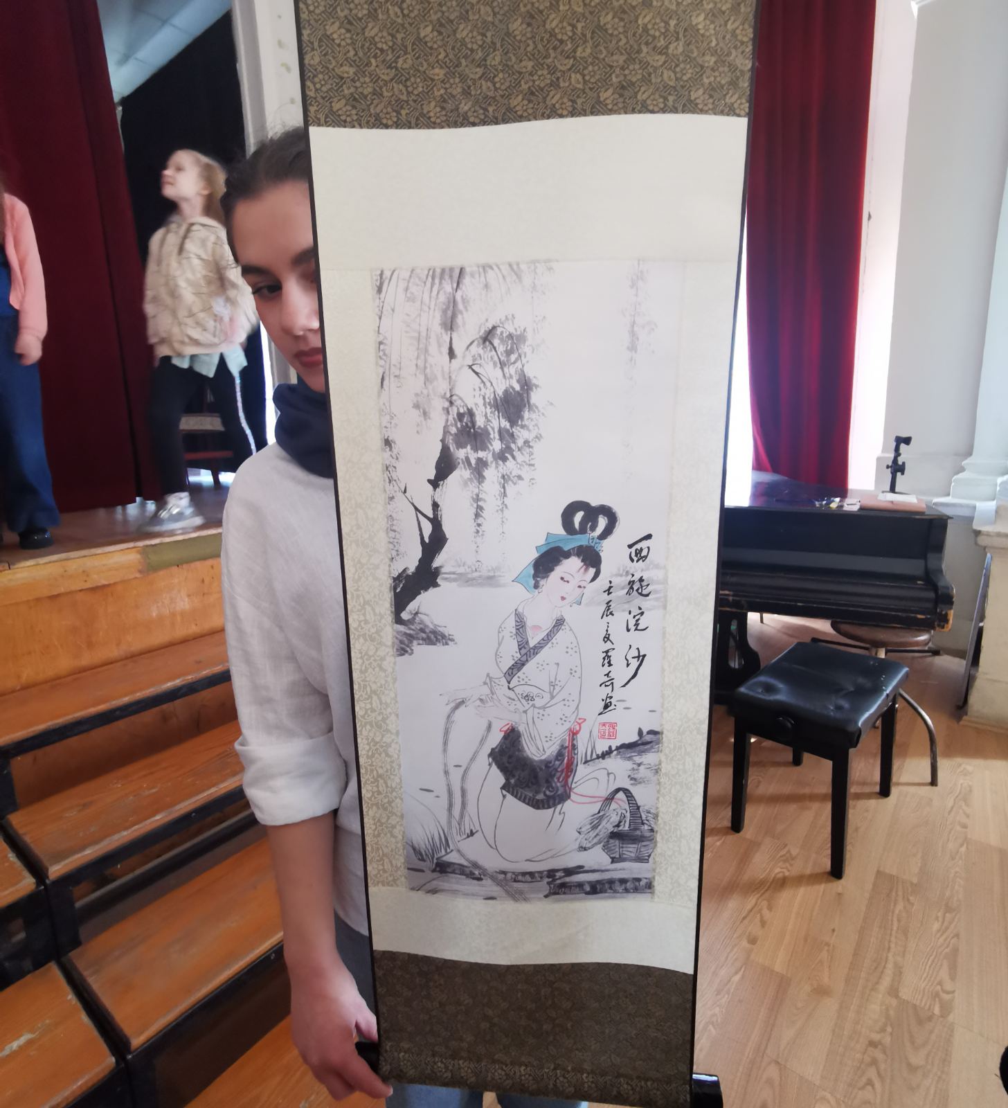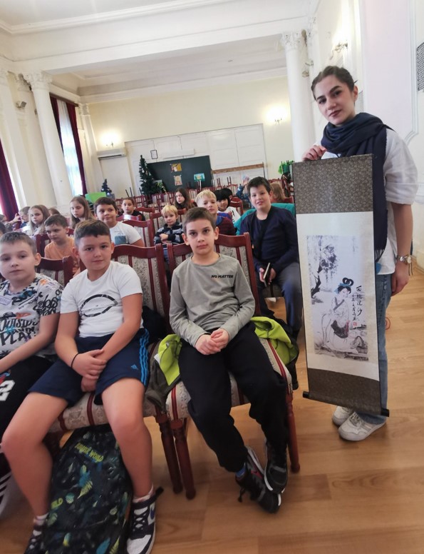Први час и окупљање свих ученика који желе да овладају основама писмености и конверзације на кинеском језику уприличено је у свечаној сали школе у петак, 10.10.2025. године. Наставница Љубица Ђорђевић, која је испред Института Конфуције одређена да ове године реализује наставу у нашој школи, представила се ученицима и заинтересовала их је „Легендом о четири кинеске лепотице“ и сликом једне од њих, Си Ши, насликане на свитку свиле донетим из Шангаја који је наставница представила ученицима.