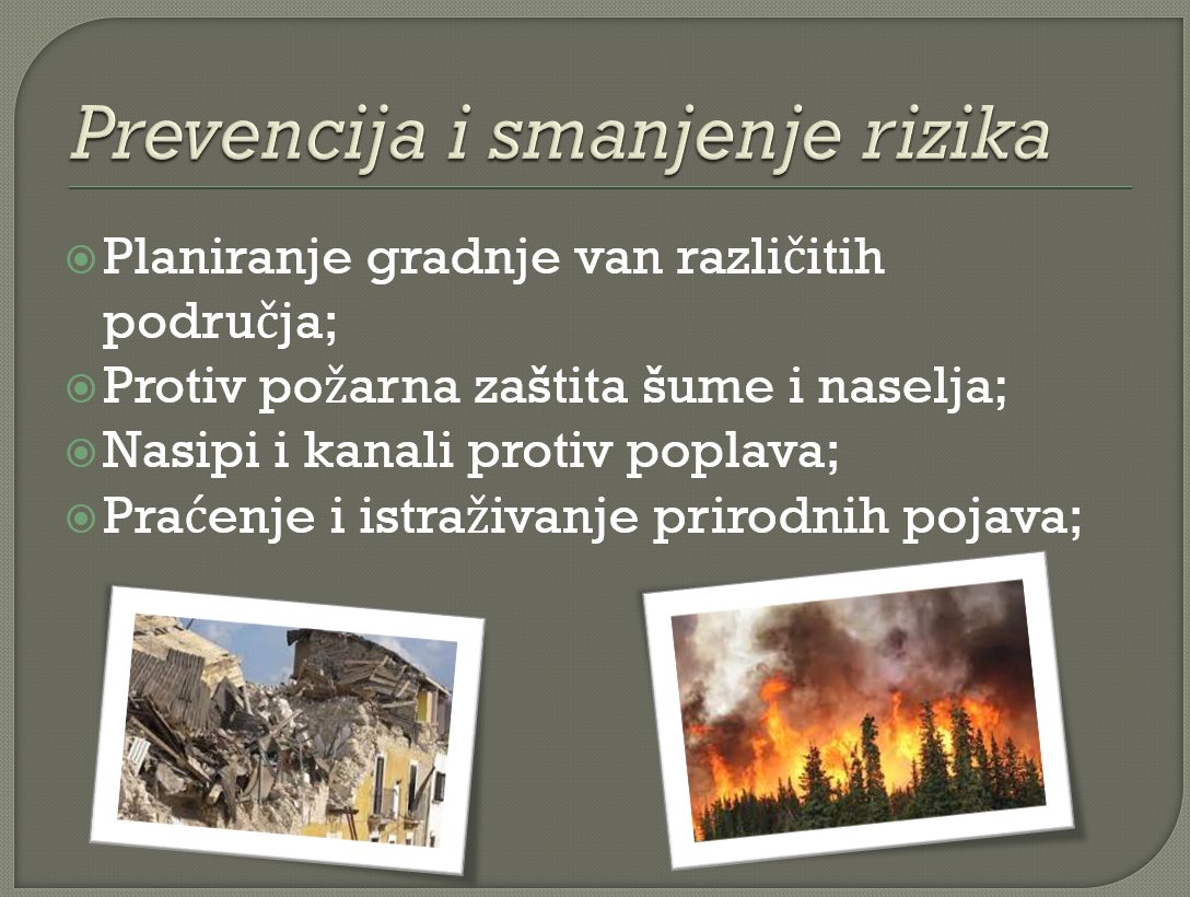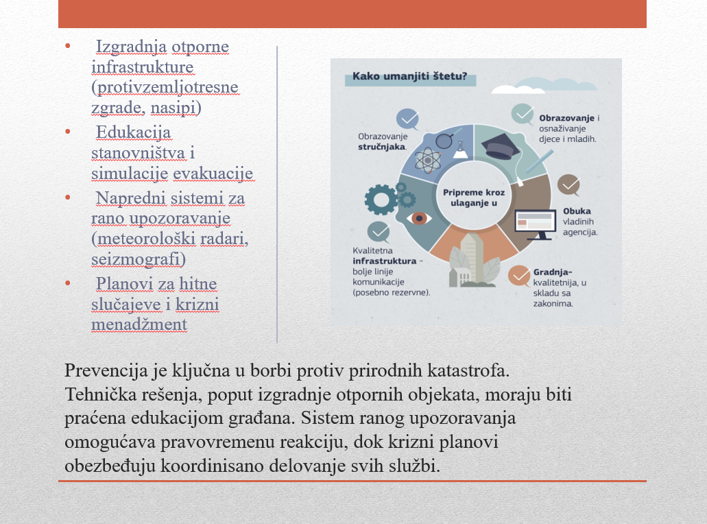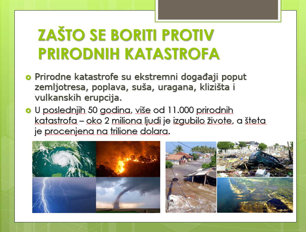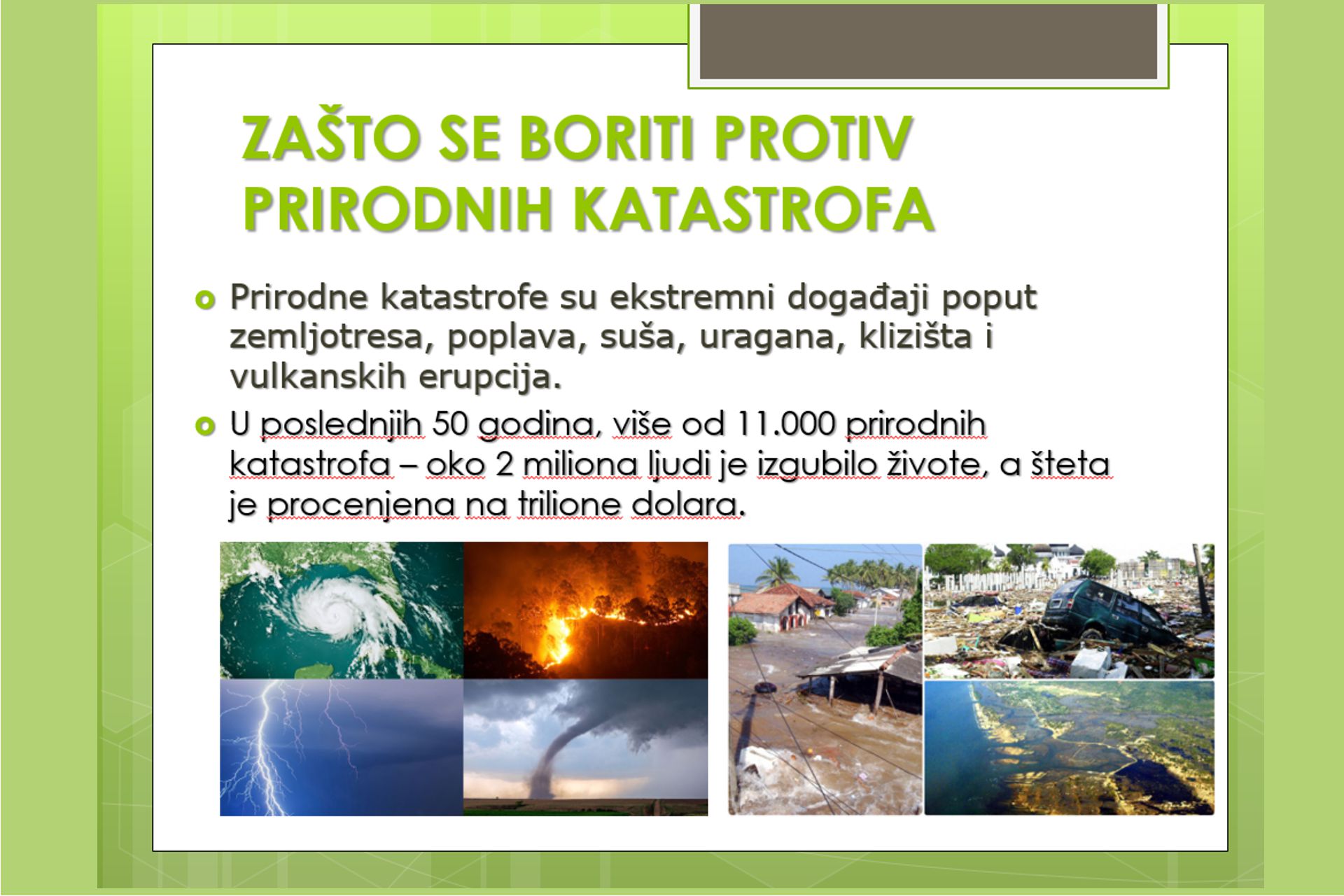 Наши ученици седмих и осмих разреда су, у оквиру предмета: биологија, информатика и рачунарство, техника и технологија, израдили радове на тему борбе против природних катастрофа – панои, презентације, видеоклипови, ликовни радови, а развијајући друга знања и вештине и ширећи интересовање ка мерама заштите озонског омотача.