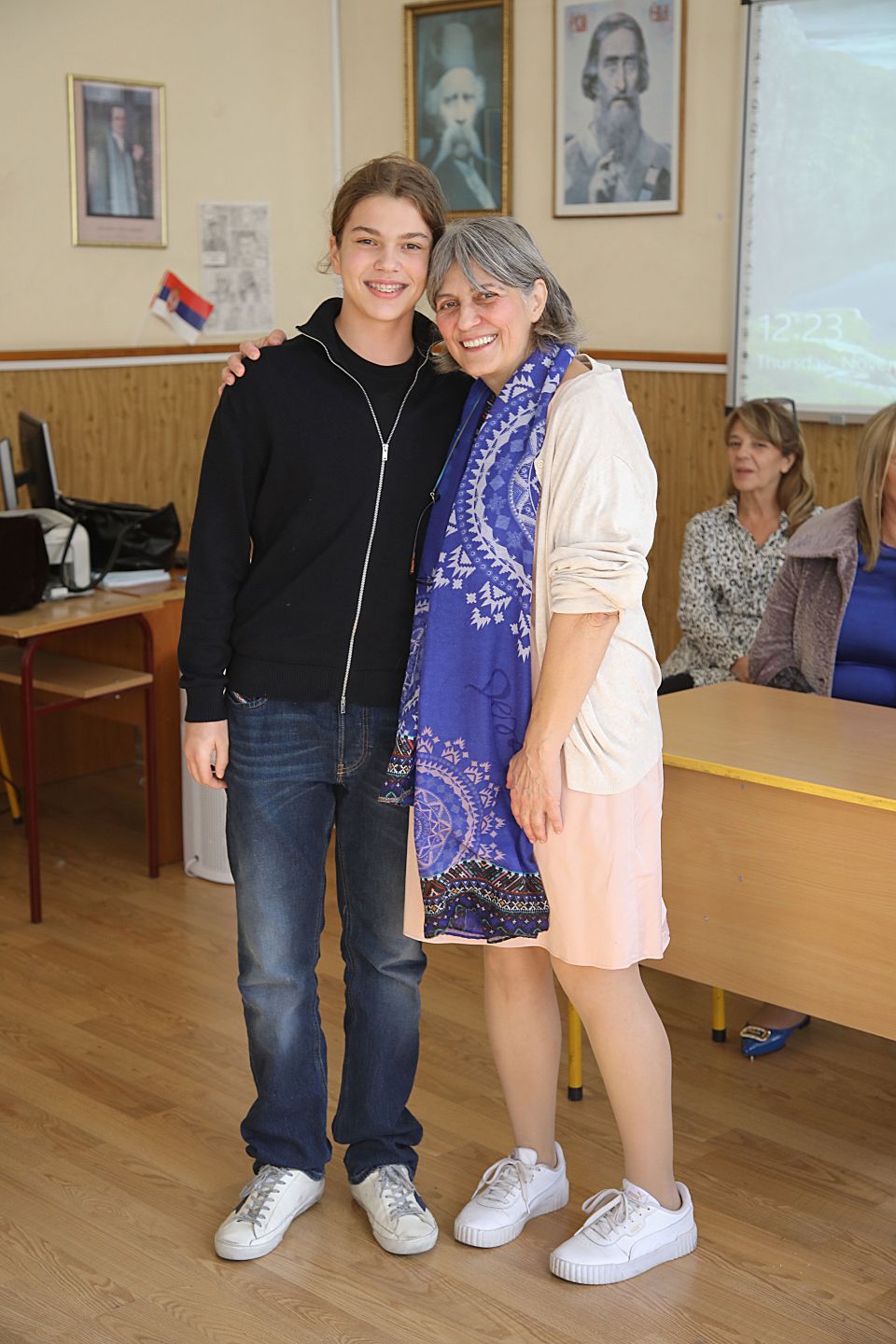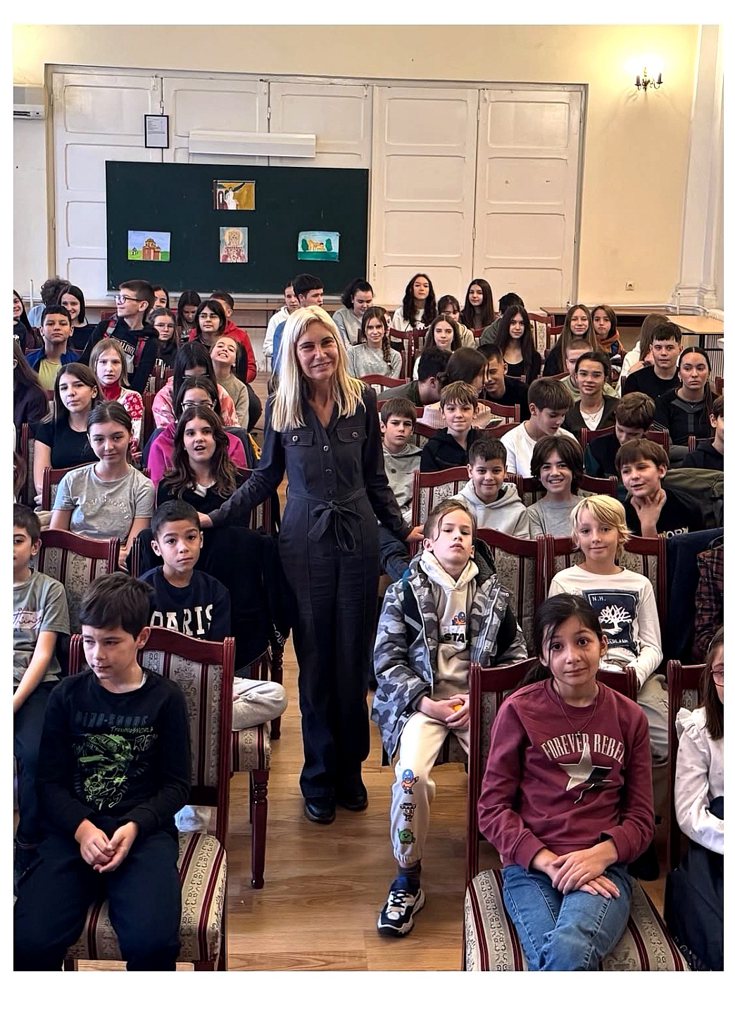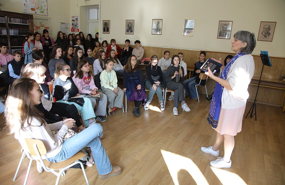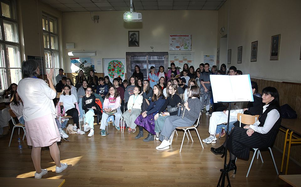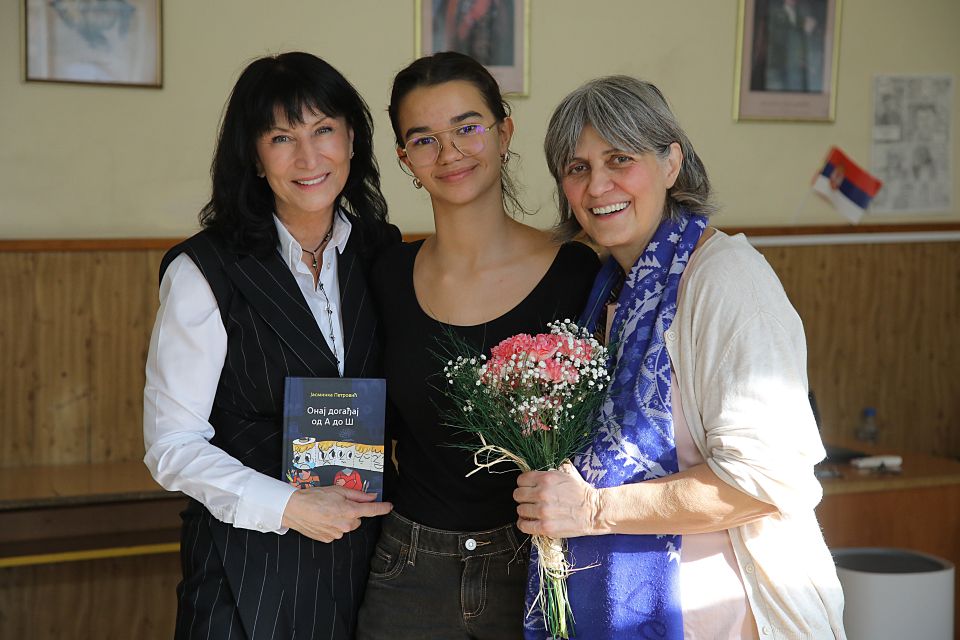 На позив професорке Снежане Костадиновић и одељења 8/2, гост Дана школе била је истакнута и деци омиљена књижевница Јасминка Петровић која је спонтано, надахнуто и сликовито одговарала на веома инспиративна питања бројних ученика и наставника. Уживали смо у топлој уметничкој атмосфери и уз драмске монологе из Јасминкиних дела који су извели ученици Стефан Глушчевић, Сара Милатовић и Нина Даниловић. Атмосферу је употпунила и нежна композиција коју је на флаути извела ученица Миона Цветковић. Време уз нашу драгу Јасминку неосетно је пролетело, али се радујемо поновном сусрету.