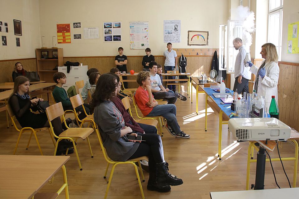 Кабинет хемије и физике који је био препун посетилаца изведене су радионице „Са хемијом на ти“ и „Физичарење“. Наставници Божидар Копања и Драгана Томић потрудили су се да ученике петог разреда на приступачан начин упознају са светом хемије и физике. Посебно им је било занимљиво извођење и резултати изведених експеримената „Слоновкска паста“ и „Дух из лампе“, добијање водоника и кисеоника, спознаја шта је то електрицитет, трење, притисак. Посебну подршку пружили су старији ученици који су активно помагали наставницима у извођењу огледа.