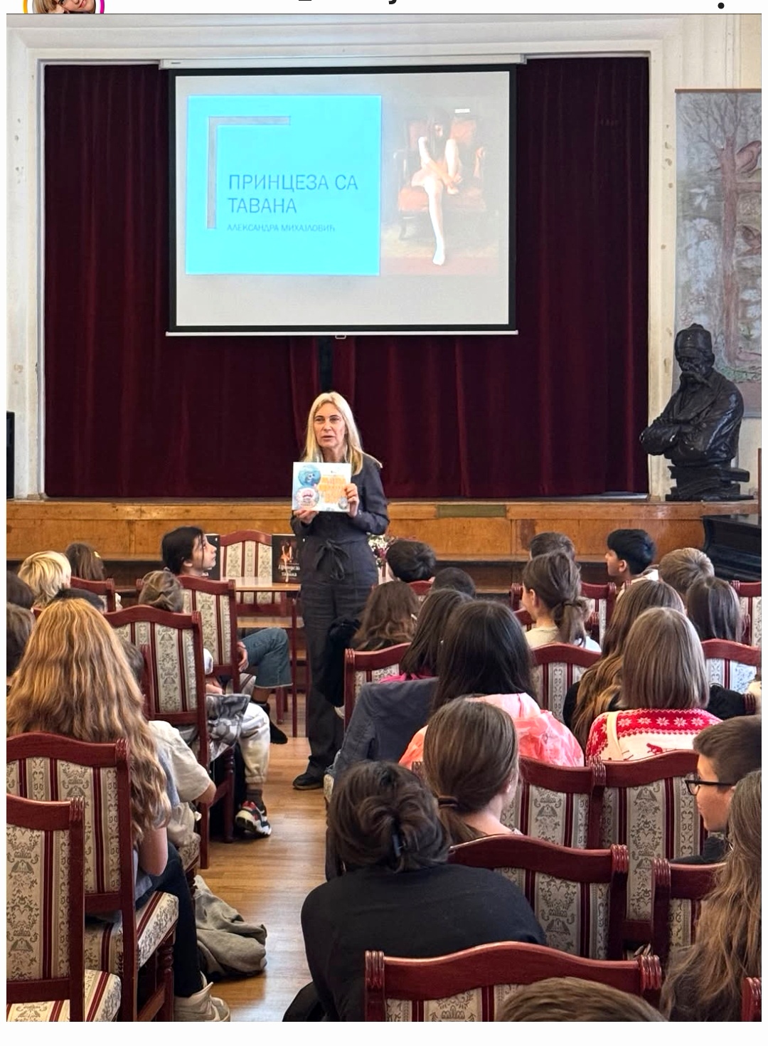У препуној свечаној сали школе, 7. новембра у подне пред публиком узраста од другог до осмог разреда, своју књигу „Принцеза са тавана“, представила је књижевница Александра Михајловић која је била веома инспиративна у излагању књижевне грађе о шеснаест владарки из богате српске историје. Наши ученици су били веома радознали, разговорљиви и сјаним идејама, знањем и мислима позитивно изненађивали и одушевљавали нашу драгу гошћу којој је ово друго гостовање у нашој школи на обострано задовољство.